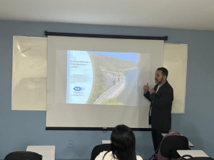 Durante a apresentação, foram abordados diversos tópicos relevantes, como A água como elemento natural essencial e seu valor social e econômico; O ciclo hidrológico e sua importância para o equilíbrio ambiental e o bem-estar coletivo; As grandes infraestruturas associadas aos setores de recursos hídricos e saneamento básico; As fundamentações legais e os mecanismos de governança na gestão dos recursos hídricos e na prestação dos serviços de saneamento; A configuração atual dos serviços de saneamento básico no Estado do Rio de Janeiro; Os desafios do setor, incluindo as metas de universalização e a necessidade crescente de profissionais qualificados.