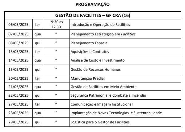 O Conselho Regional de Administração do Rio de Janeiro, em parceria com a Associação dos Antigos Alunos da Politécnica da UFRJ, lança o curso Gestão de Facilities com descontos especiais para registrados. O curso visa capacitar Profissionais na Administração de infraestrutura e logística de edifícios, abordando temas como manutenção predial, segurança patrimonial, análise de custo e implantação de novas tecnologias.