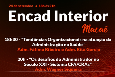 No dia 24 de setembro, o CRA-RJ irá promover o 13º Encontro de Administradores em Macaé. O evento será realizado no Auditório Cláudio Ulpiano – Complexo Universitário de Macaé, na Rua Aloisio da Silva Gomes, Granja dos Cavaleiros, 50 e começará às 18h. Serão apresentadas as palestras “Tendências Organizacionais na atuação da Administração na Saúde”, com as Administradoras e membros da Comissão Especial de Saúde do CRA-RJ Maria de Fátima Ribeiro dos Santos e Rita de Cássia Garcia; além de “Os desafios do Administrador no Século XXI”, com o Adm. Wagner Siqueira, presidente do CFA.