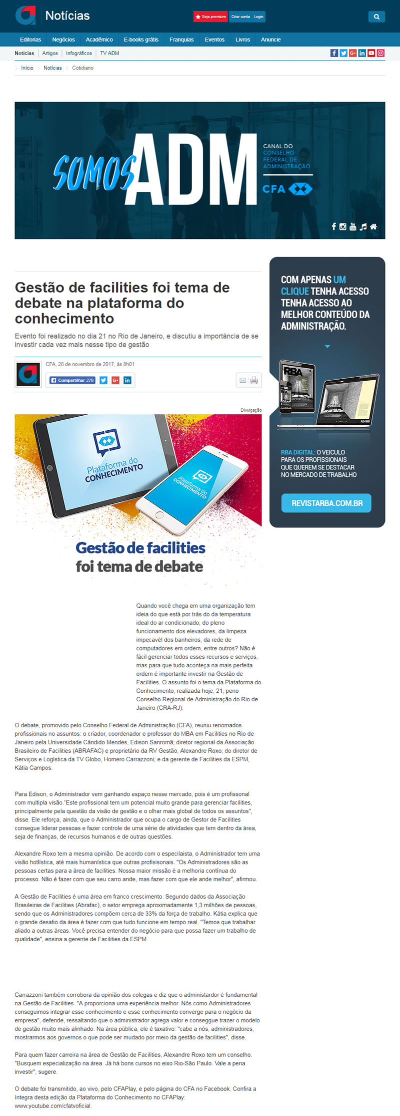 usercassiocrarj2017-11-28T12:12:59-02:0028/11/2017|Categories: CRA-RJ na Mídia, CRA-RJ na Mídia - 2017, Sala de Imprensa|Tags: Administradores.com, Debate, Gestão de facilities, Plataforma do Conhecimento, Tema|