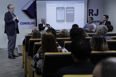O coordenador da comissão fez a abertura e, durante o evento, a plateia e os internautas podiam participar com o desafio “Defina Governança Corporativa em apenas uma palavra”. Ao decorrer da palestra, as palavras iam mudando e dando lugar a diversas formas para entender mais a área.
