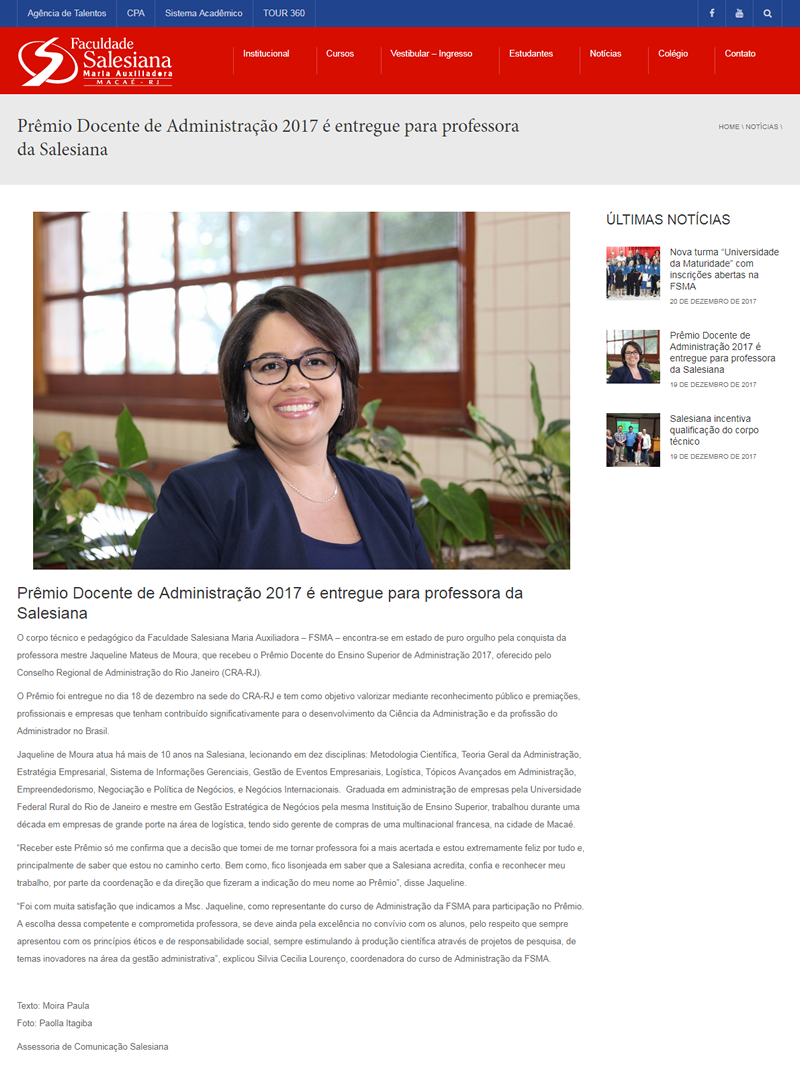 Prêmio Docente de Administração 2017 é entregue para professora da Salesiana