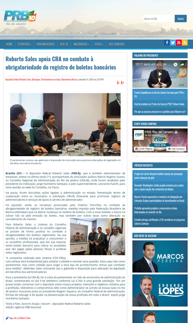 Roberto Sales apoia CRA no combate à obrigatoriedade do registro de boletos bancários